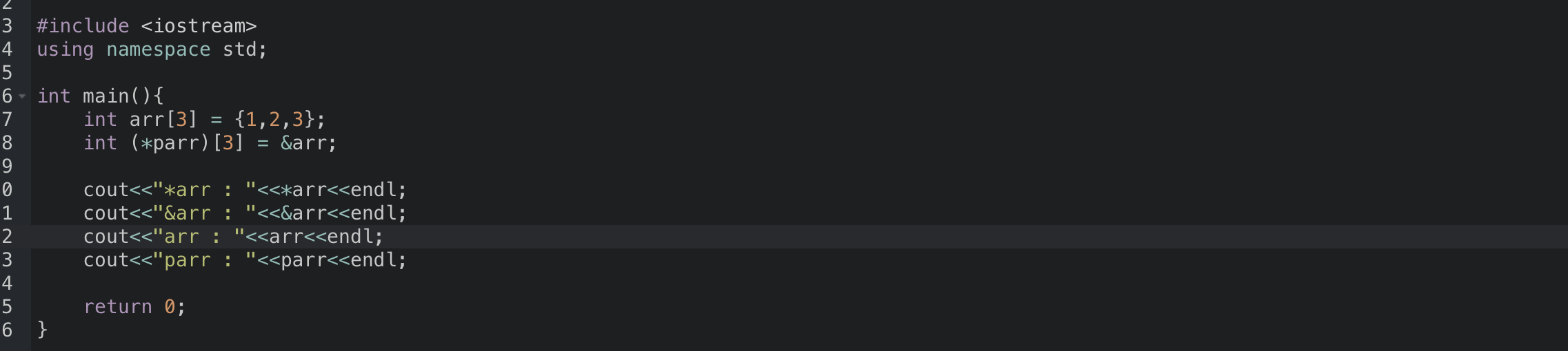 // arr은 크기가 3인 배열이기 때문에, &arr을 보관할 포인터는 크기가 3인 배열을 가리키는 포인터가 되어야 한다.