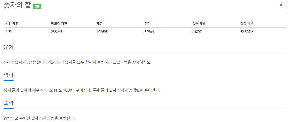 N개의 숫자가 공백 없이 쓰여있다. 이 숫자를 모두 합해서 출력하는 프로그램을 작성하시오.