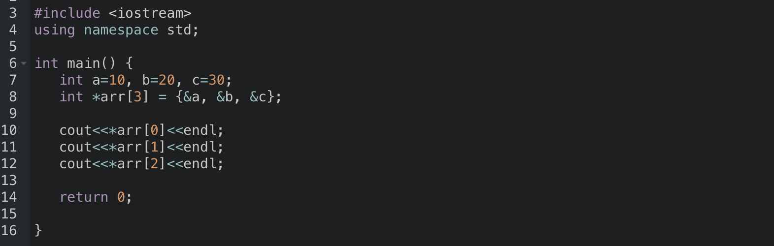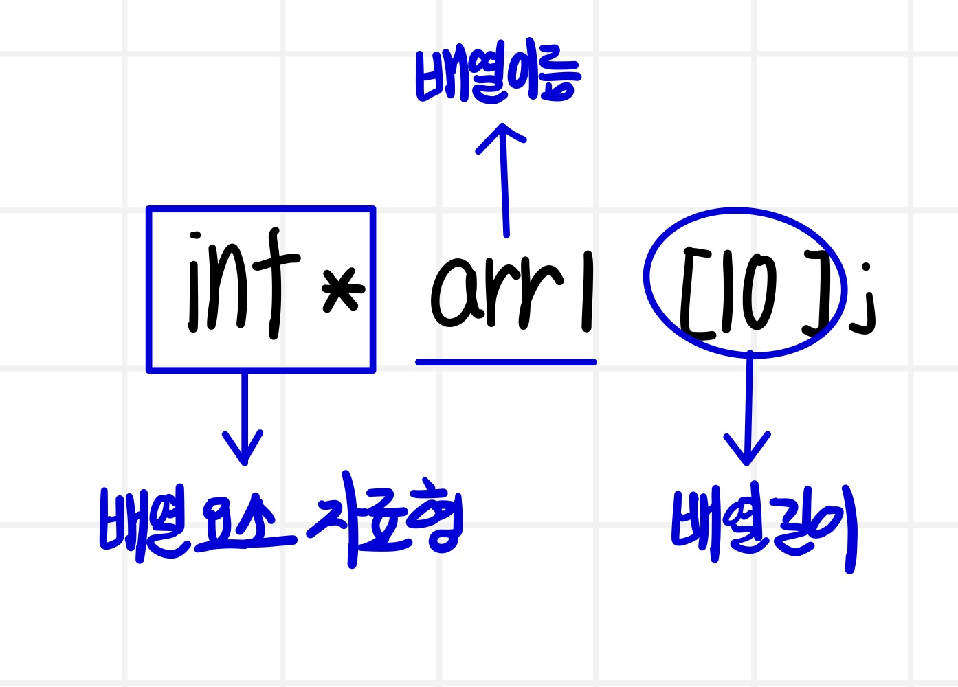 int * arr1[10]; // int형 변수를 가르키는, 포인터 배열 arr1은, 포인터 변수 10개를 담는다. (변수 10개를 가르킨다.)