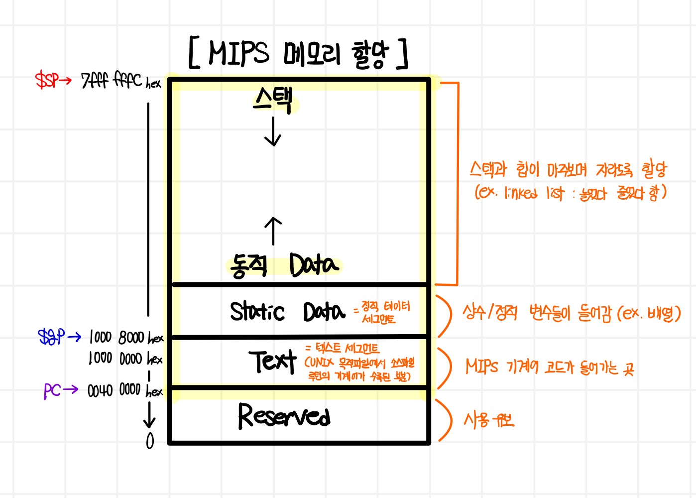 * 스택 포인터 : 가장 최근에 스택에 할당된 주소를 가리키는 값. 레지스터가 스필 될 장소(아래로 스필될 수 있음) 또는 레지스터의 옛날 값을 찾을 수 있는 장소(위로 찾을 수 있음)를 표시한다. MIPS에서는 $sp이다.