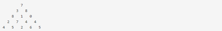 맨 위층 7부터 시작해서 아래에 있는 수 중 하나를 선택하여 아래층으로 내려올 때, 이제까지 선택된 수의 합이 최대가 되는 경로를 구하는 프로그램을 작성하라. 아래층에 있는 수는 현재 층에서 선택된 수의 대각선 왼쪽 또는 대각선 오른쪽에 있는 것 중에서만 선택할 수 있다.