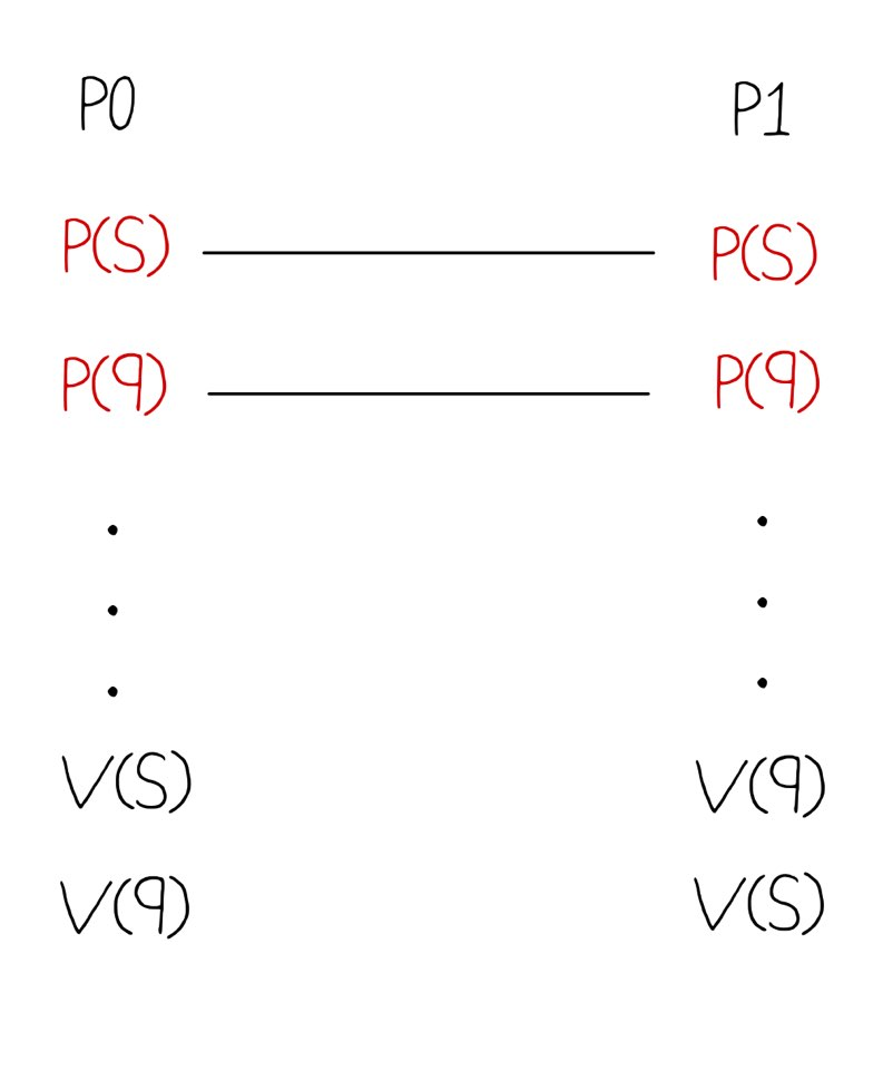 // cf. 일반적인 semaphore는 자원의 권한을 1로 시작하는데, 이 코드에서는 권한을 0으로 설정한 후, test단계에서 조건을 만족하면 1로 바꾼다. 이를 V연산을 통해 실행한다.