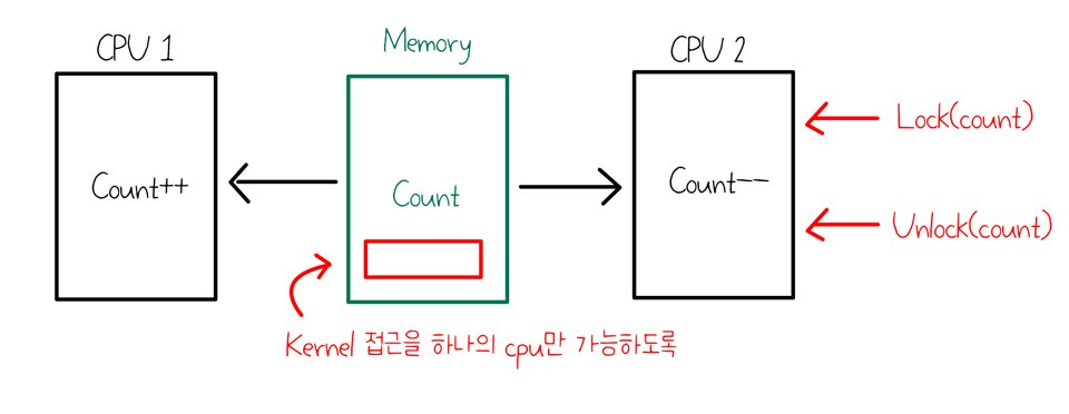 * 여러 cpu가 운영체제 커널에 동시에 접근하기 때문에 발생하는 문제이므로, 이 커널에 접근하는 cpu를 한개로 제한하는 것이 해결방안이 된다.