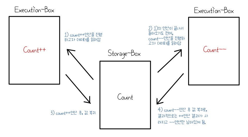 # S-box(Memory Address Space)를 공유하는 E-box(CPU Process)가 여러개 있는 경우, Race Condition의 가능성이 있다.