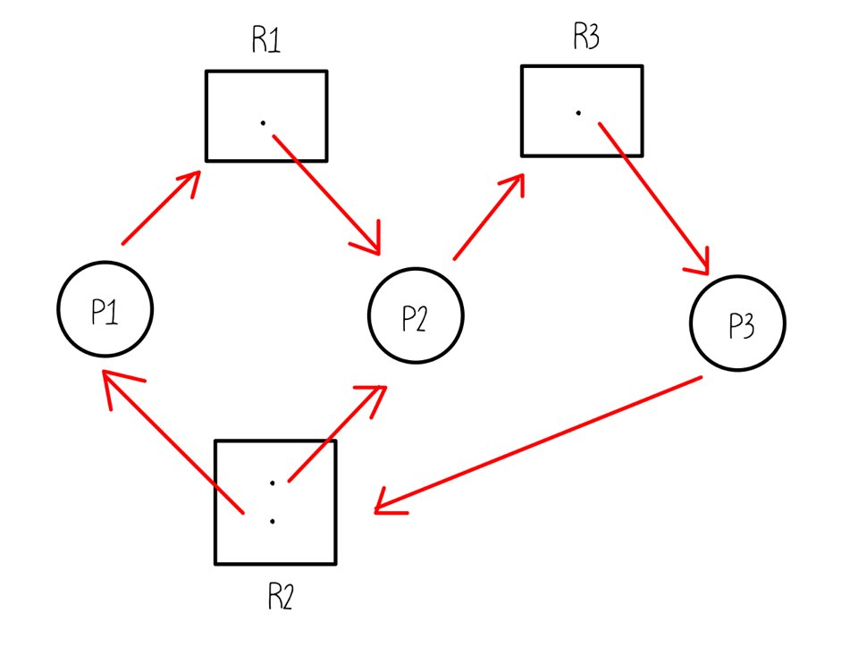 - 즉, 필요로 하는 자원들이 꼬리에 꼬리를 물고, 서로가 가진 자원을 기다리면서 사이클을 형성해야 한다.
