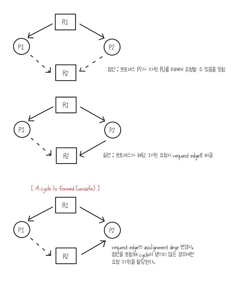 - 시스템이 unsafe state에 있으면 : possibility of deadlock