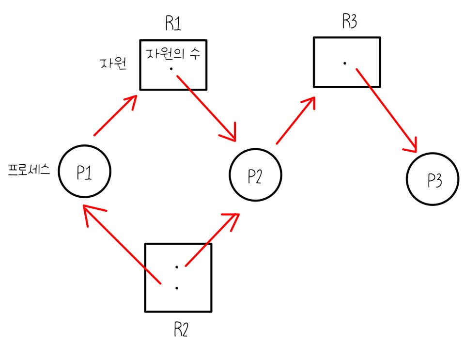 - 자원을 기다리는 프로세스간에 사이클이 형성되어야 함.