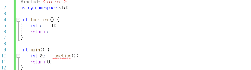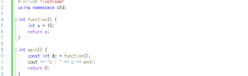 - 함수의 리턴값은 해당 문장이 끝나고 바로 사라지는 값이기 때문에, 이와같이 참조자를 만들게 되면 바로 다음에 문제가 발생한다. 즉, 이후 c=2; 와 같은 코드를 작성하게 된다면 런타임 오류가 발생할 것이다.