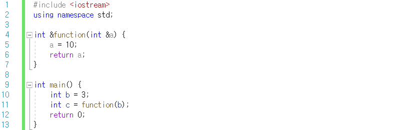 | int function(){...} [함수에서 값 리턴] | int & function(int & a){...} [함수에서 참조자 리턴] |