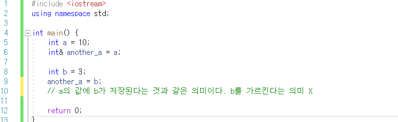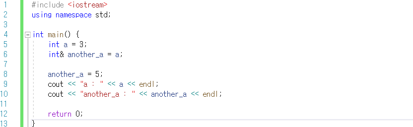 - int & another_a = a; // another_a는, int형 변수 a의 참조자이다.