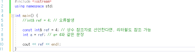 const int &ref = 4; // 상수 참조자로 선언한다면, 리터럴도 참조할 수 있다. (값이 변화하지 않기 때문에)