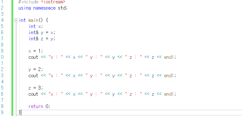 - 위의 내용에서 참조자의 참조자는 만들 수 없도록 금지되어 있다고 했다. 그리고 자세히 살펴보면 위의 내용은, 결국 x의 참조자를 선언해라와 같은 의미가 되서, z역시 x의 참조자가 될 것이다.