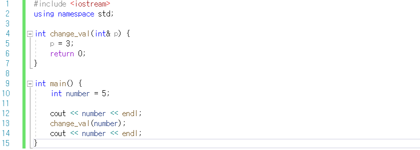 //그냥 정의하는 int&p는 이루어질 수 없지만, 이는 함수가 호출될 때 정의되므로, 결과적으로 int&p = number;가 실행되는 것과 같다고 생각하면 된다.