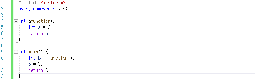 // 따라서 function이 반환한 참조자는, 결국 int &ref = int &a = b가 되어서, 계속 살아있는 변수인 b를 참조한다.