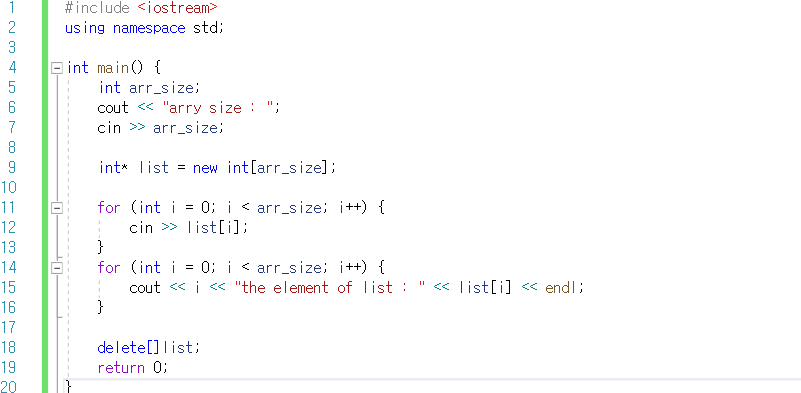 - int *list = new int[arr_size]; // 포인터 변수 list에, new를 이용하여 크기가 arr_size인 int 배열을 생성한 주소를 넣었다.