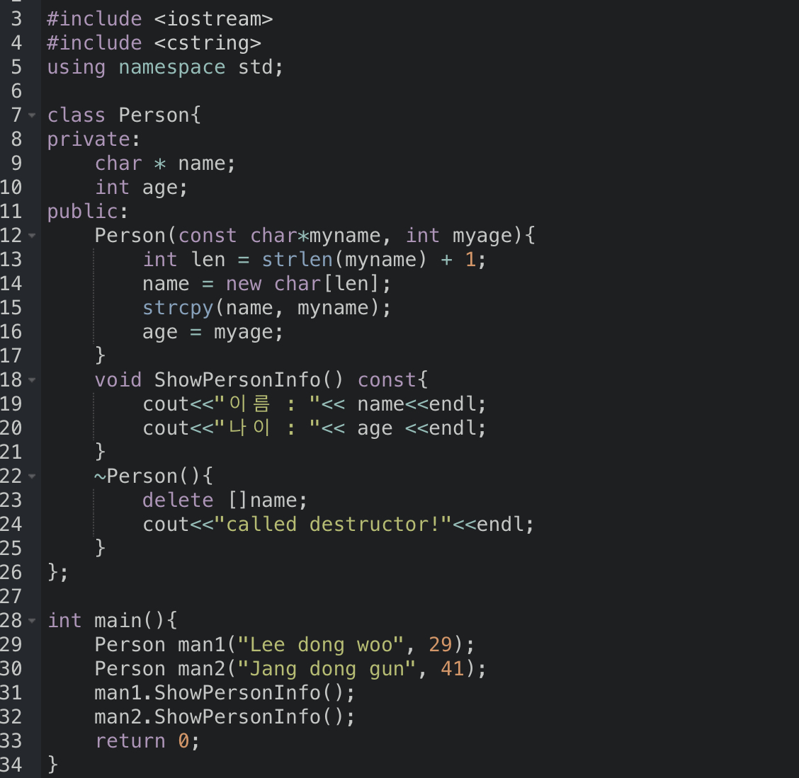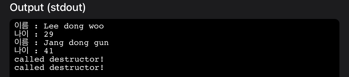 Person man1("Lee dong woo", 29); // man1이라는 새로운 Person 클래스의 객체를 인스턴스화한다. 이 과정에서 동적 할당이 발생한다.