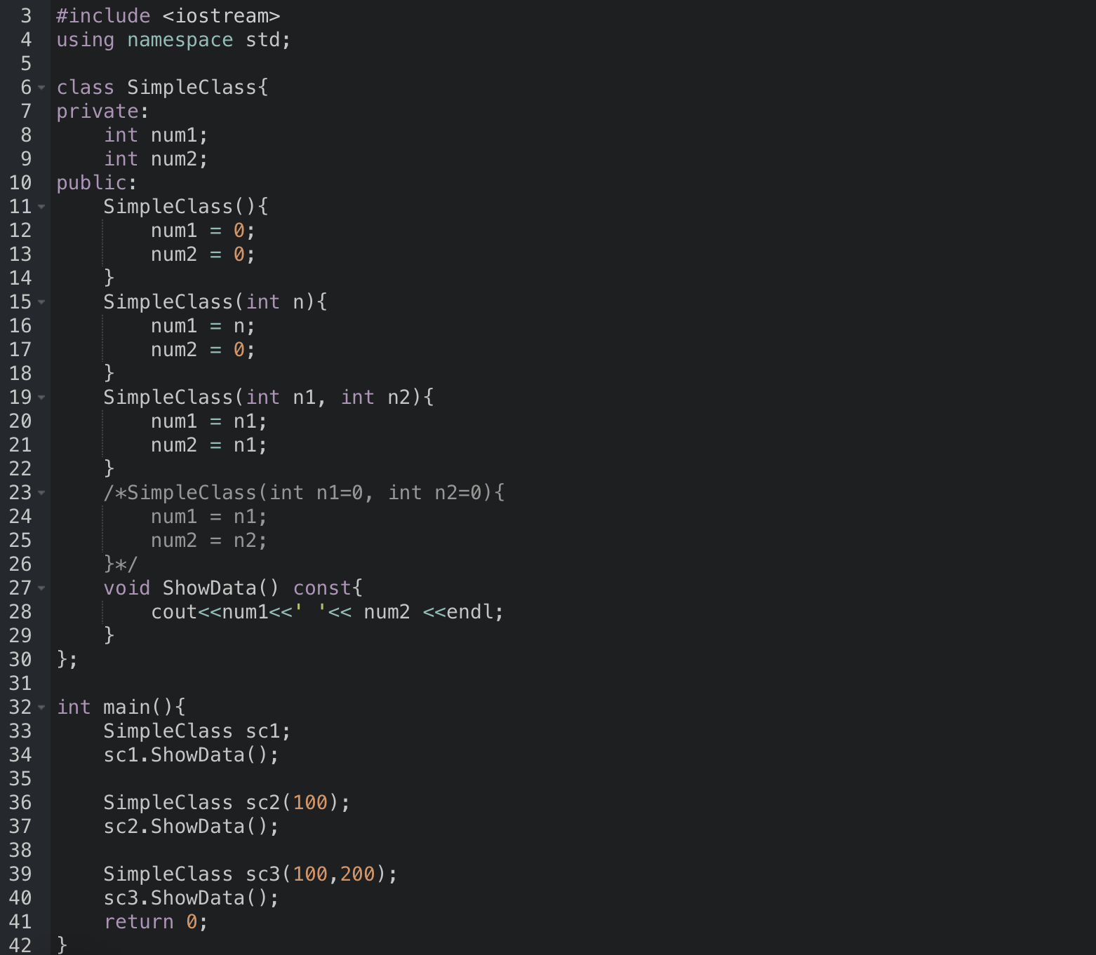 SimpleClass(int n1 = 0, int n2 = 0){ ... } // 매개변수가 2개일 경우 오버로딩 가능. 그러나 매개변수가 1개여도, 0으로 디폴트 값 설정되었기 때문에 가능.