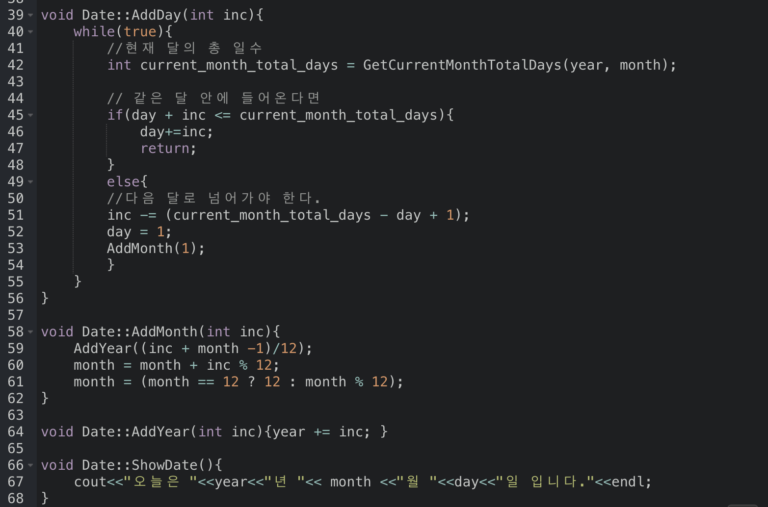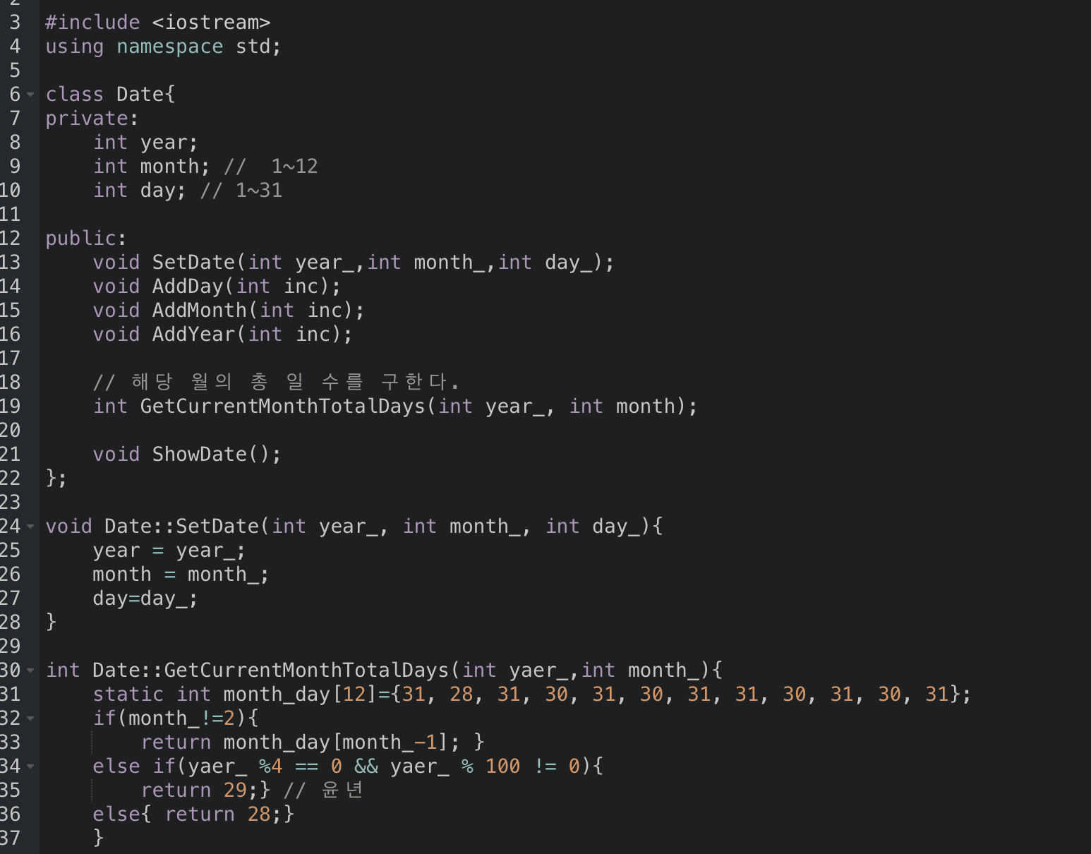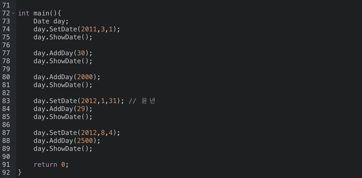 - Date::을 함수 이름 밖에 붙여주게 되면, 이 함수가 Date 클래스의 정의된 함수라는 이름을 부여하게 된다.