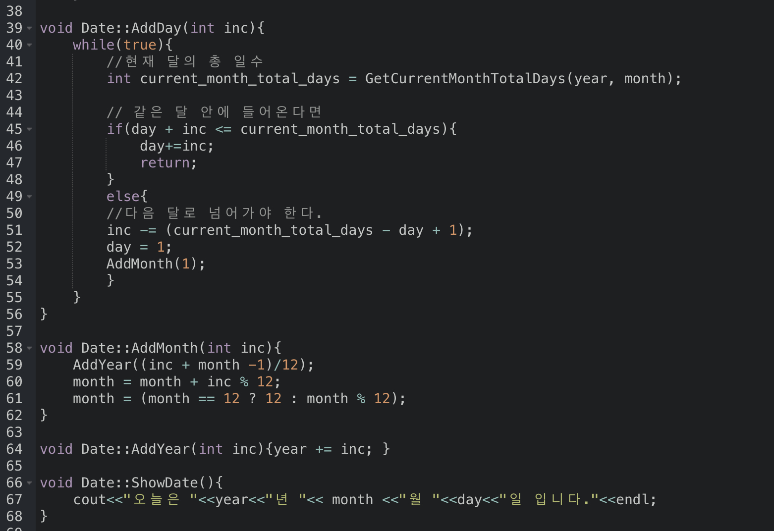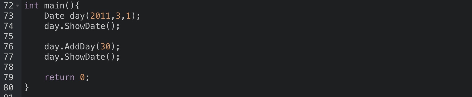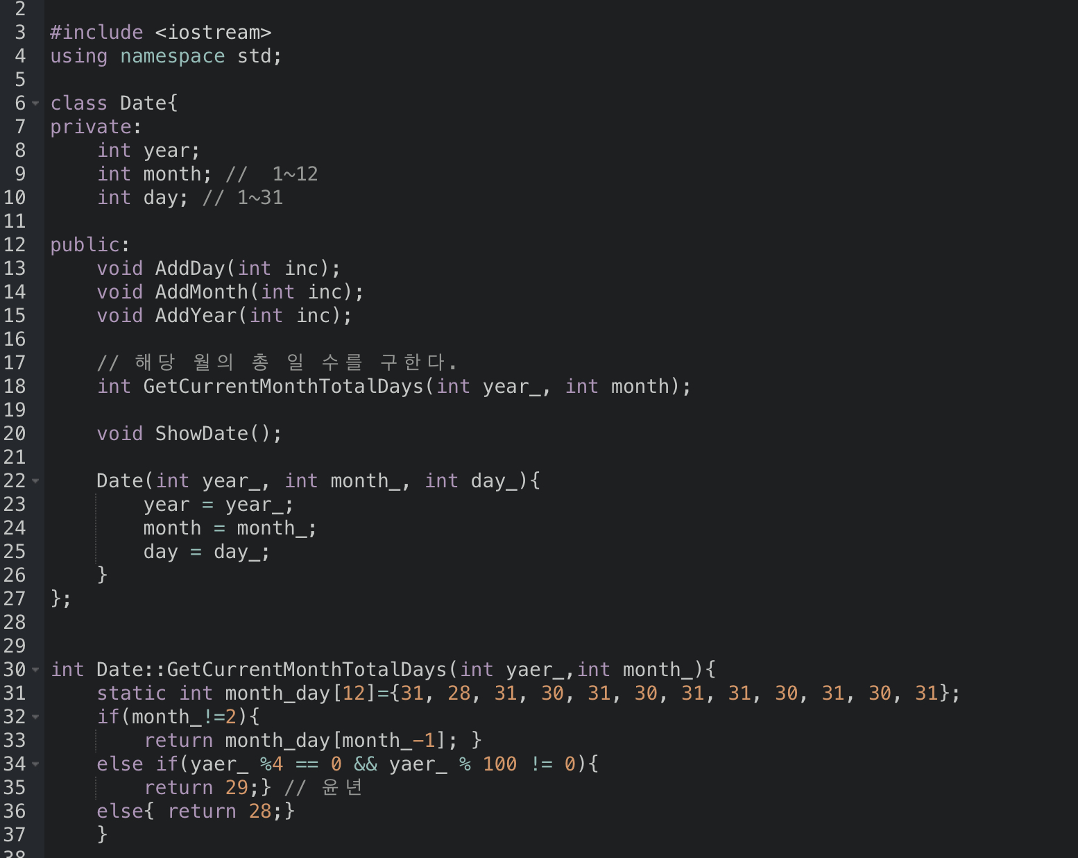 - Date::을 함수 이름 밖에 붙여주게 되면, 이 함수가 Date 클래스의 정의된 함수라는 이름을 부여하게 된다.