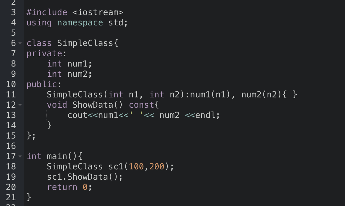 // 절대로 인자가 없는 생성자를 호출하기 위해서 SimpleClass sim();와 같이 하면 안된다. 이 문장은 SimpleClass형을 반환하는 함수, sim을 정의한 문장이다.