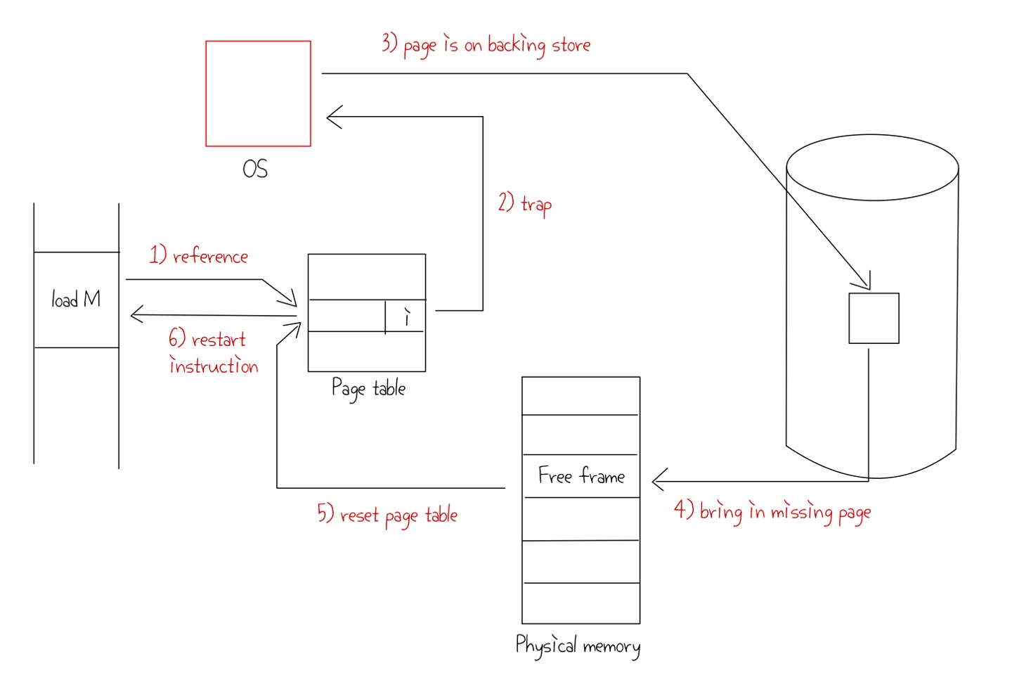 - 다음과 같은 순서로 page fault를 처리한다.