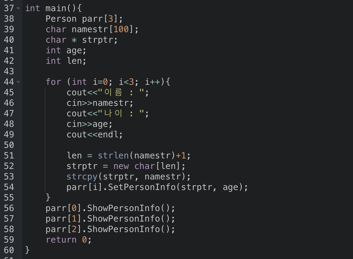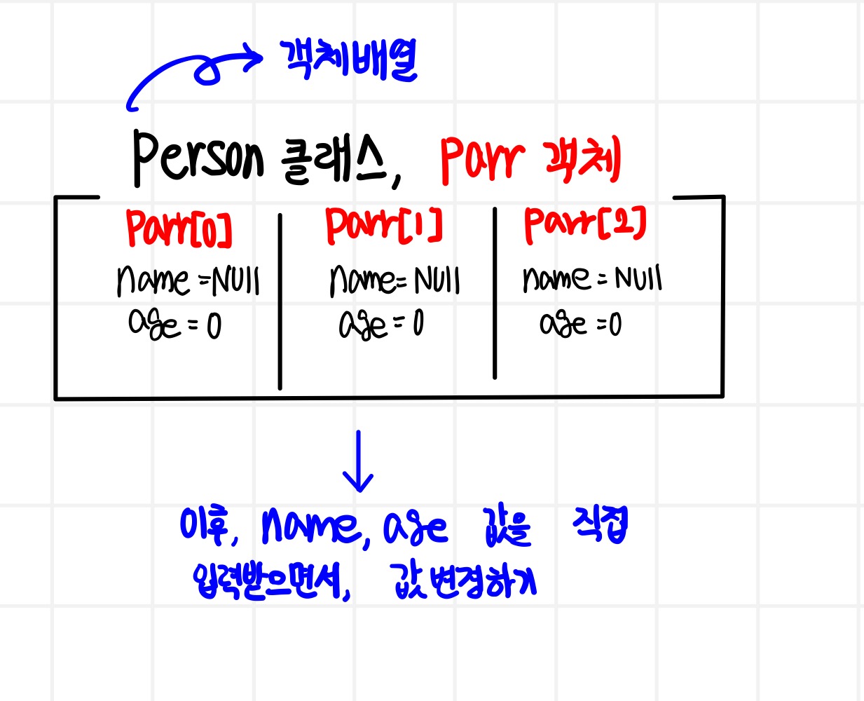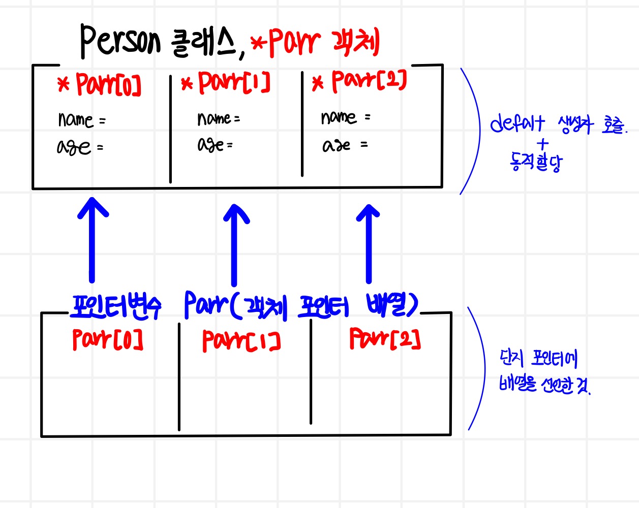 // parr의 각 칸들은 포인터(주소를 담아야 함)들이기 때문에, Person(namestr, age)의 형식이 아니라, 동적으로 객체를 생성해주는 new Person(namestr, age)의 형식으로 생성자를 호출해주어야 한다.
