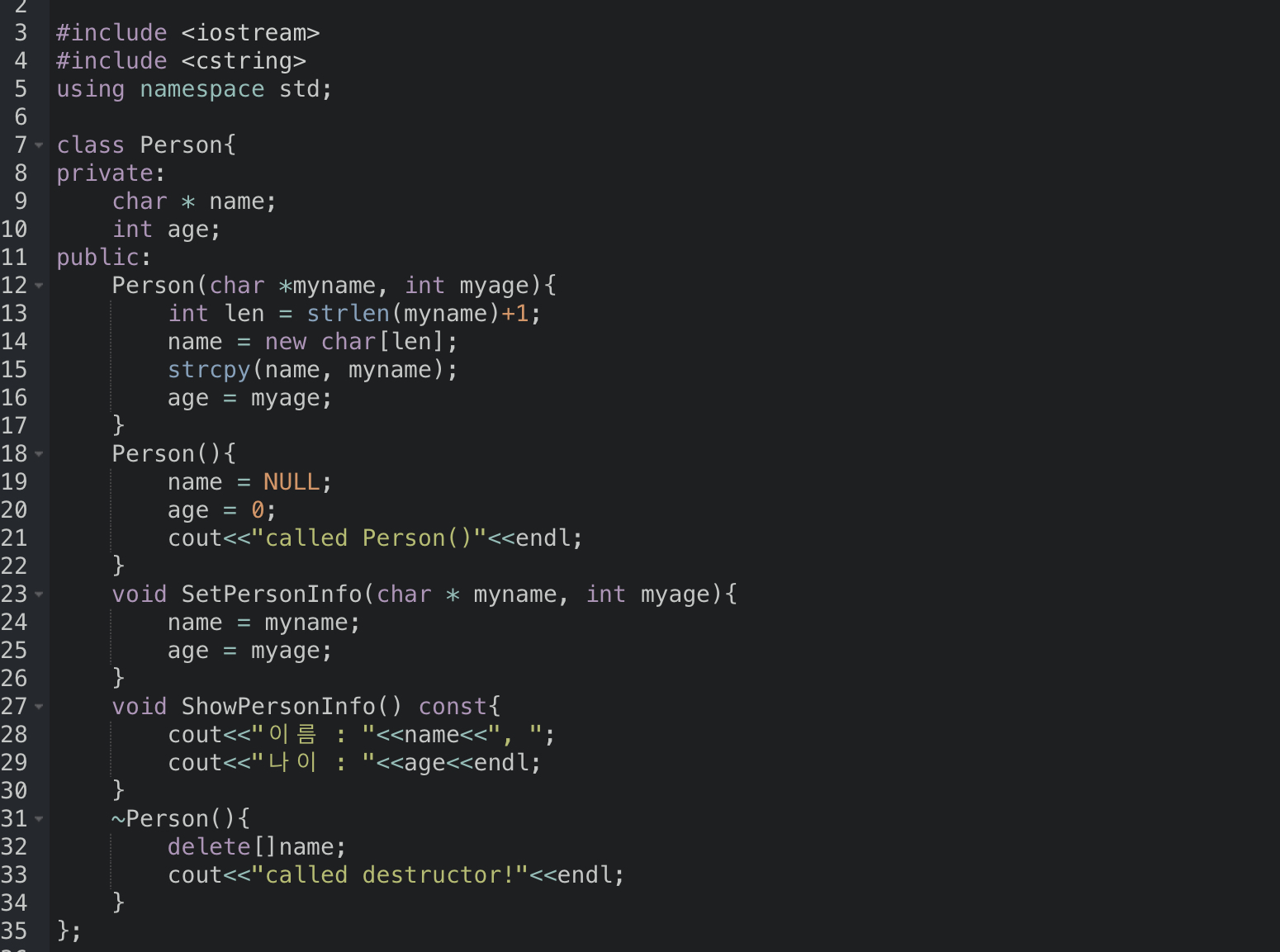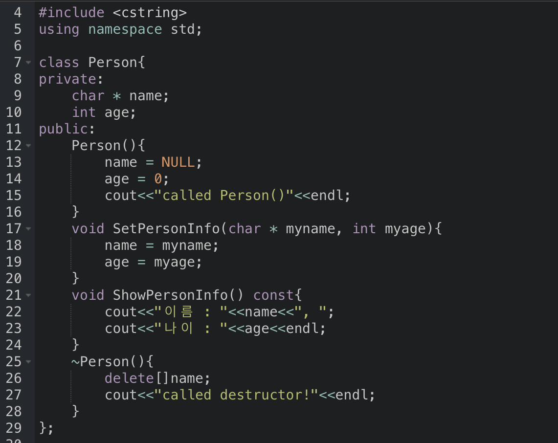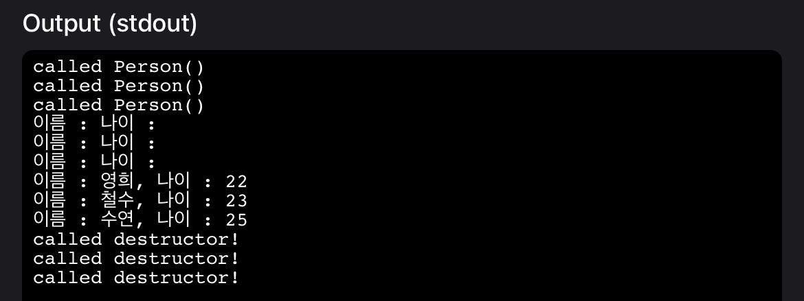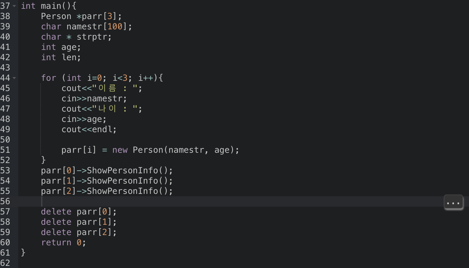 // parr의 각 칸들은 포인터(주소를 담아야 함)들이기 때문에, Person(namestr, age)의 형식이 아니라, 동적으로 객체를 생성해주는 new Person(namestr, age)의 형식으로 생성자를 호출해주어야 한다.
