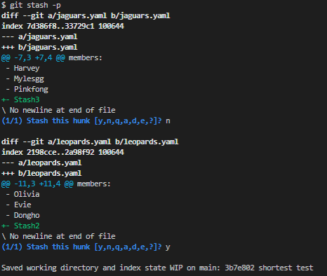 # y(yes) 또는 n(no)로 각 hunk add 여부 선택 => 이를 통해 파일 내 수정사항 일부만 add 가능