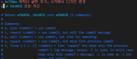 * pick을 어떻게 수정하고 저장하느냐에 따라서, 각 커밋에 대해 무엇을 할 지 지정 가능하다.