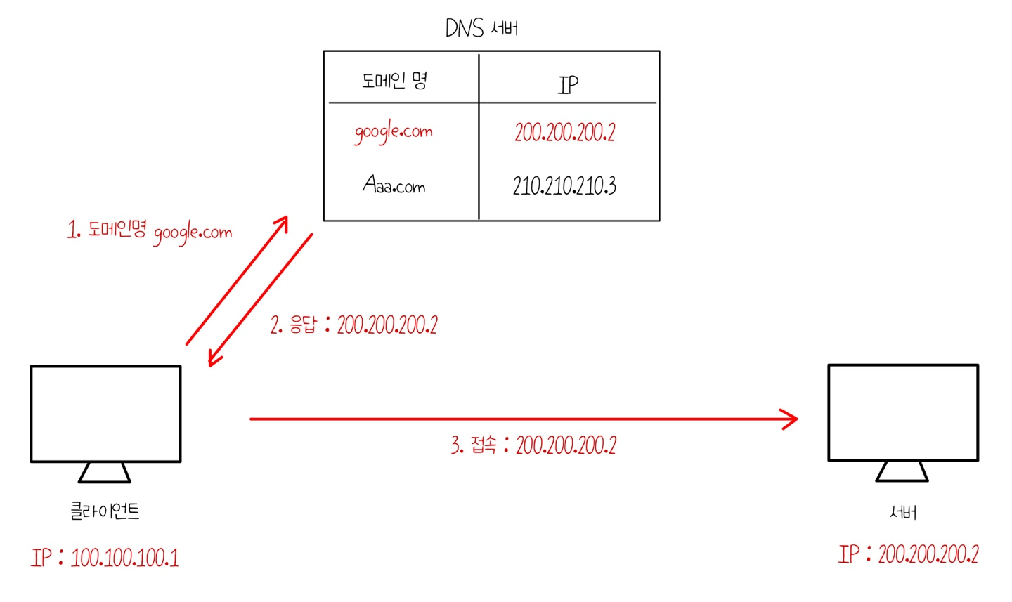 * 클라이언트에서 해당 도메인명을 입력하면, DNS서버가 자동으로 해당 IP주소로 변환하여 응답하며, 접근하도록 돕는다.