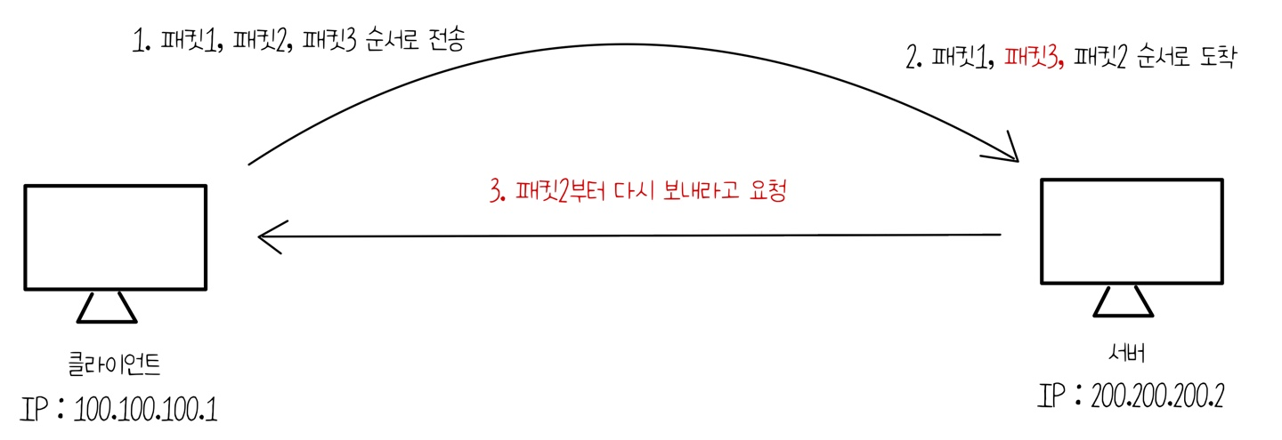 : 데이터를 전송하게 되면, 잘 전송받았는지 다시 보내주기 때문에, 중간에 패킷이 누락될 경우 확인 가능하다.