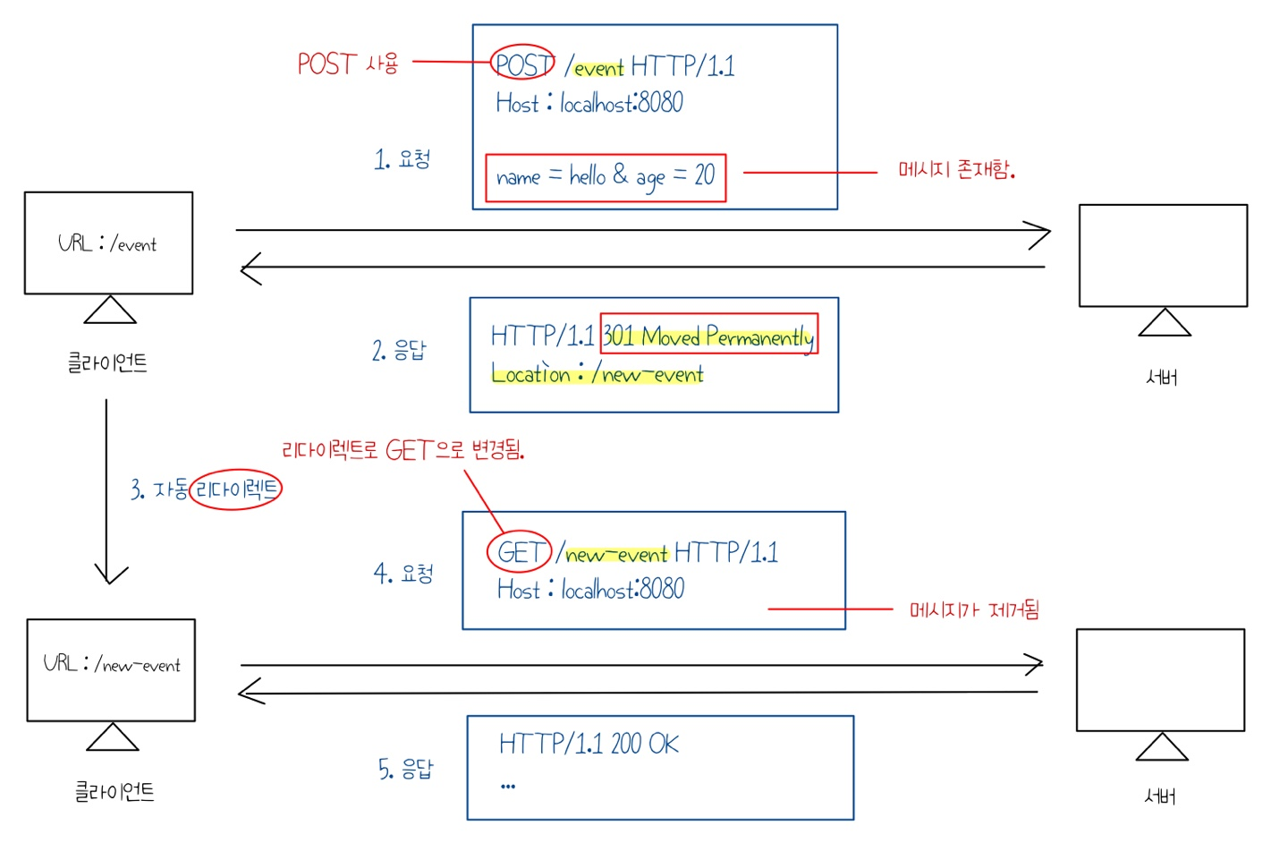 - 리다이렉트시, 요청 메서드가 GET으로 변하고, 본문이 제거될 수 있다. (거의 제거됨)