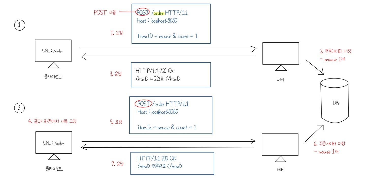 - 이후 웹 브라우저를 새로고침하게 되면, Post가 한번 더 실행되어 요청했던 것이 중복 주문이 들어갈 수 있다.