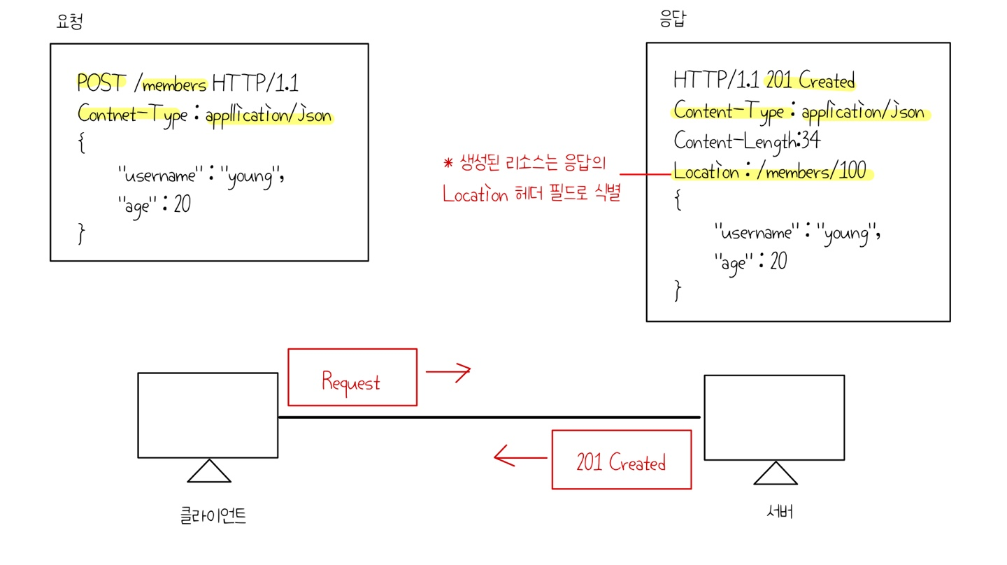- 생성된 리소스는 응답의 Location 헤더 필드로 식별한다.