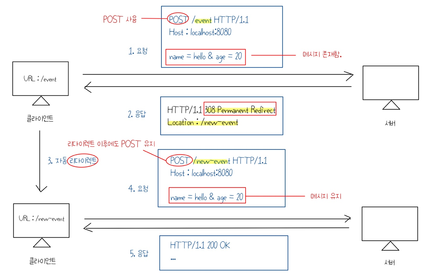 - 301과 기능은 같지만, 리다이렉트시 요청 메서드와 본문을 유지한다는 점에서 차이가 존재한다. (처음 POST를 보내면, 리다이렉트도 POST를 유지한다.)