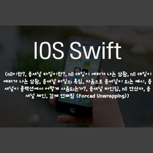 [문과 코린이의 IT 기록장] IOS Swift - nill과 Optional ( nil이란?, 옵셔널 타입이란?, nil 대입이 에러가 나는 상황, nil 대입이 에러가 나는 상황, 옵셔널 타입의 특징, 자동으로 옵셔널이 되는 예시, 옵셔널이 콜렉션에서 어떻게 사용되는가?, 옵셔널 바인딩, nil 연산자, 옵셔널 체인, 강제 언래핑 (Forced Unwrapping) )