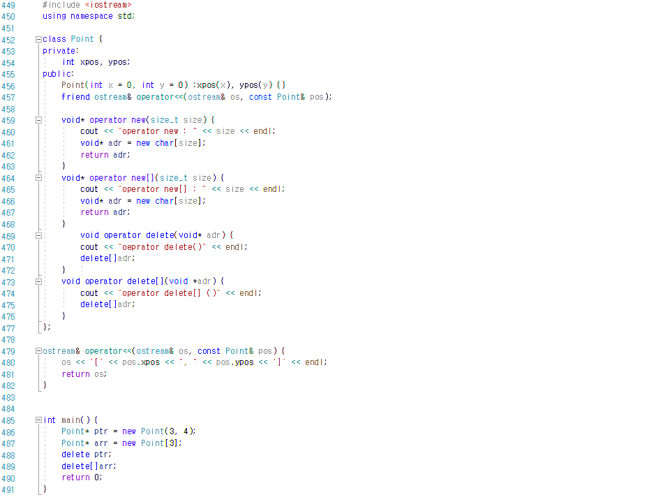 Point* arr = new Point[3]; // 배열의 생성과정에서 총 3개의 Point 객체가 생성된다. 이 3개의 Point 객체의 할당에 필요한 메모리 공간은, void *operator new[](size_t size)의 맴버함수(static 함수)의 호출에 의해 완성된다.