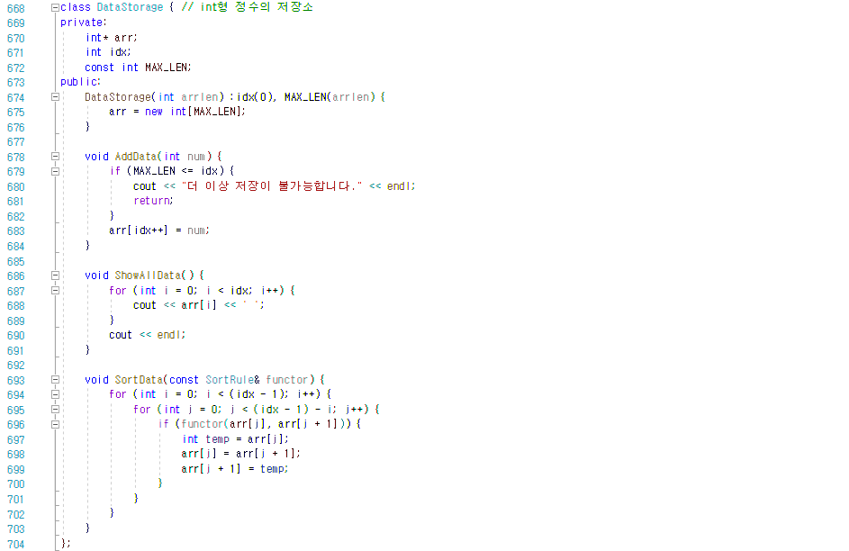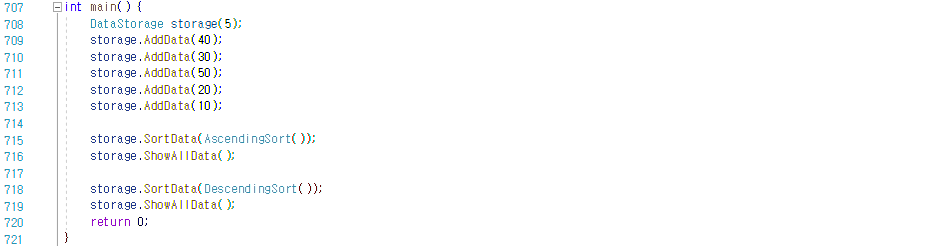 storage.SortData(AscendingSort()); // AscendingSort 객체를 임시객체의 형태로 생성해서 전달하고 있다.