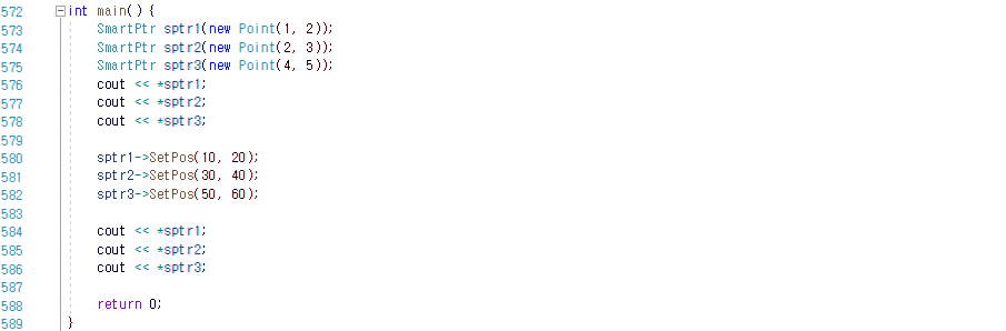 // Point 객체를 생성하면서, 동시에 스마트 포인터 SmartPtr 객체가 Point 객체를 가리키게끔 하고 있다. 따라서 sptr1, sptr2, sptr3은 Point 객체를 가리키는 포인터처럼 동작한다.