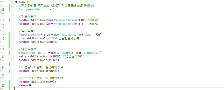 Employee* empList[50]; // 고용인 리스트 포인터 변수(Employee 객체의 주소 값을 저장하는 방식으로 객체를 저장. PermanentWorker 객체 역시 Employee 객체의 일종이므로 저장 가능.)