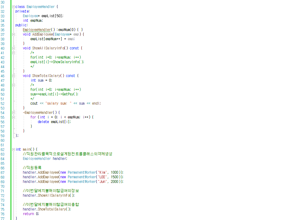 Employee* empList[50]; // 고용인 리스트 포인터 변수 (Employee 객체의 주소 값을 저장하는 방식으로 객체를 저장. PermanentWorker 객체 역시 Employee 객체의 일종이므로 저장 가능.)