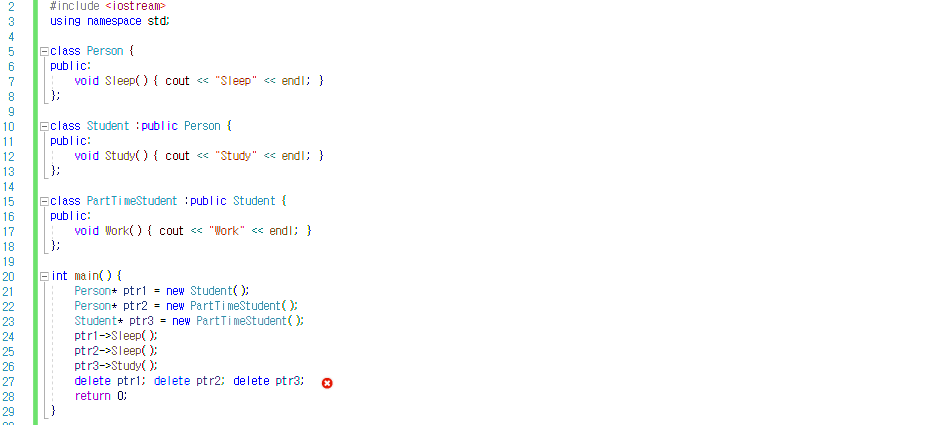 Person* ptr2 = new PartTimeStudent(); // PartTimeStudent는 Person을 간접 상속하므로, Person형 포인터 변수는 PartTimeStudent 객체를 가리킬 수 있음.