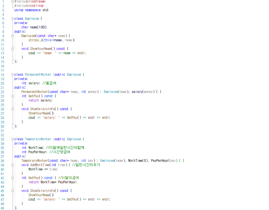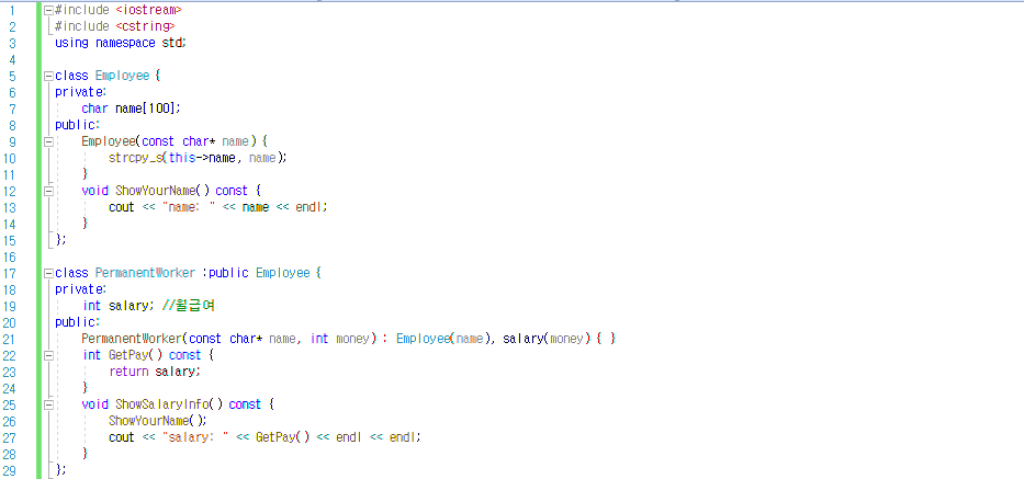 | class PermanentWorker : public Employee { // 정규직 클래스 private: int salary; // 월급여 변수 public: PermanentWorker(const char* name, int money) : Employee(name), salary(money) { } // 정규직 생성자 int GetPay() const { // 월급여 반환 함수 return salary; } void ShowSalaryInfo() const { // 정보(이름, 월급여) 출력 함수 ShowYourName(); cout << "salary: " << GetPay() << endl << endl; } }; |