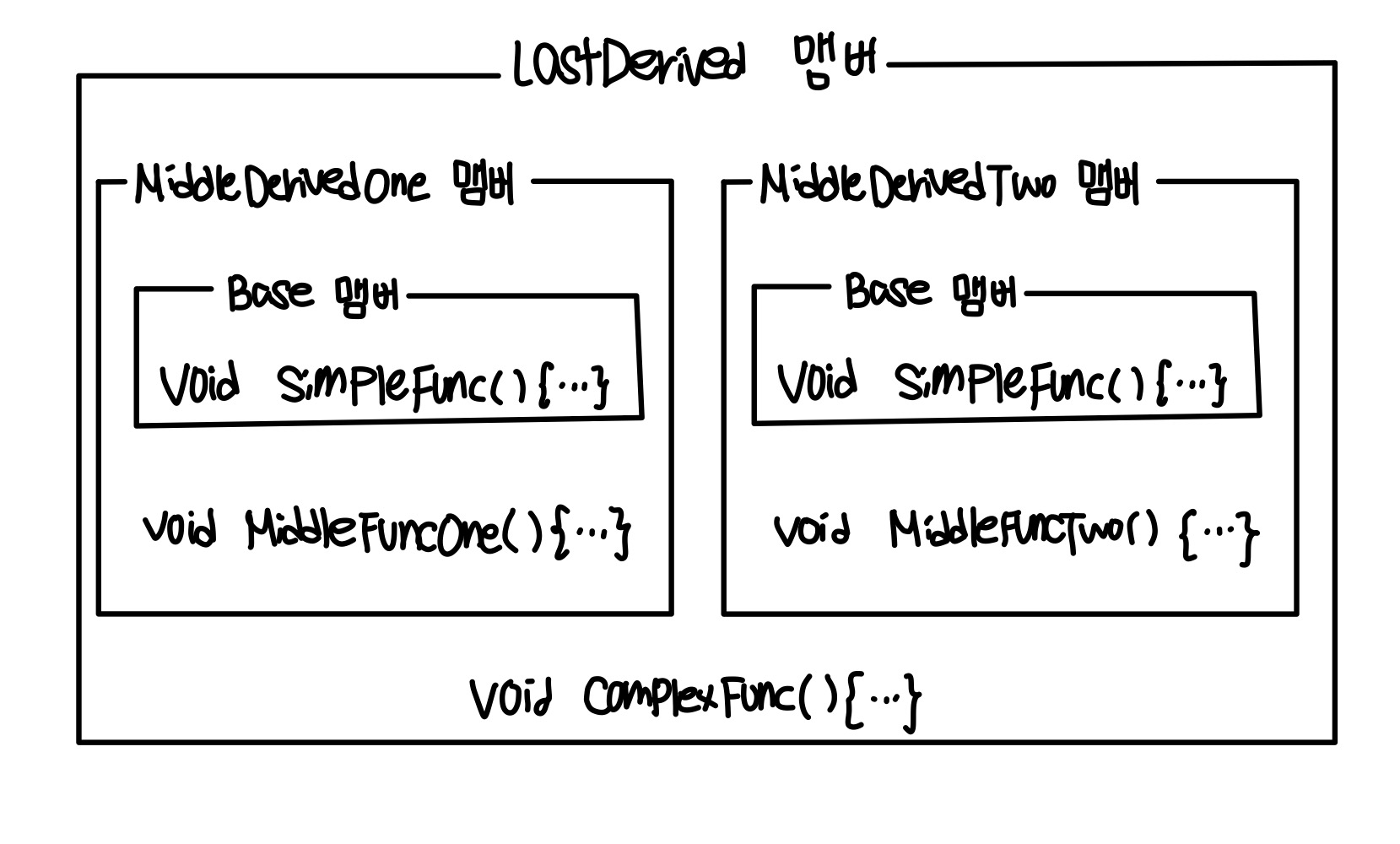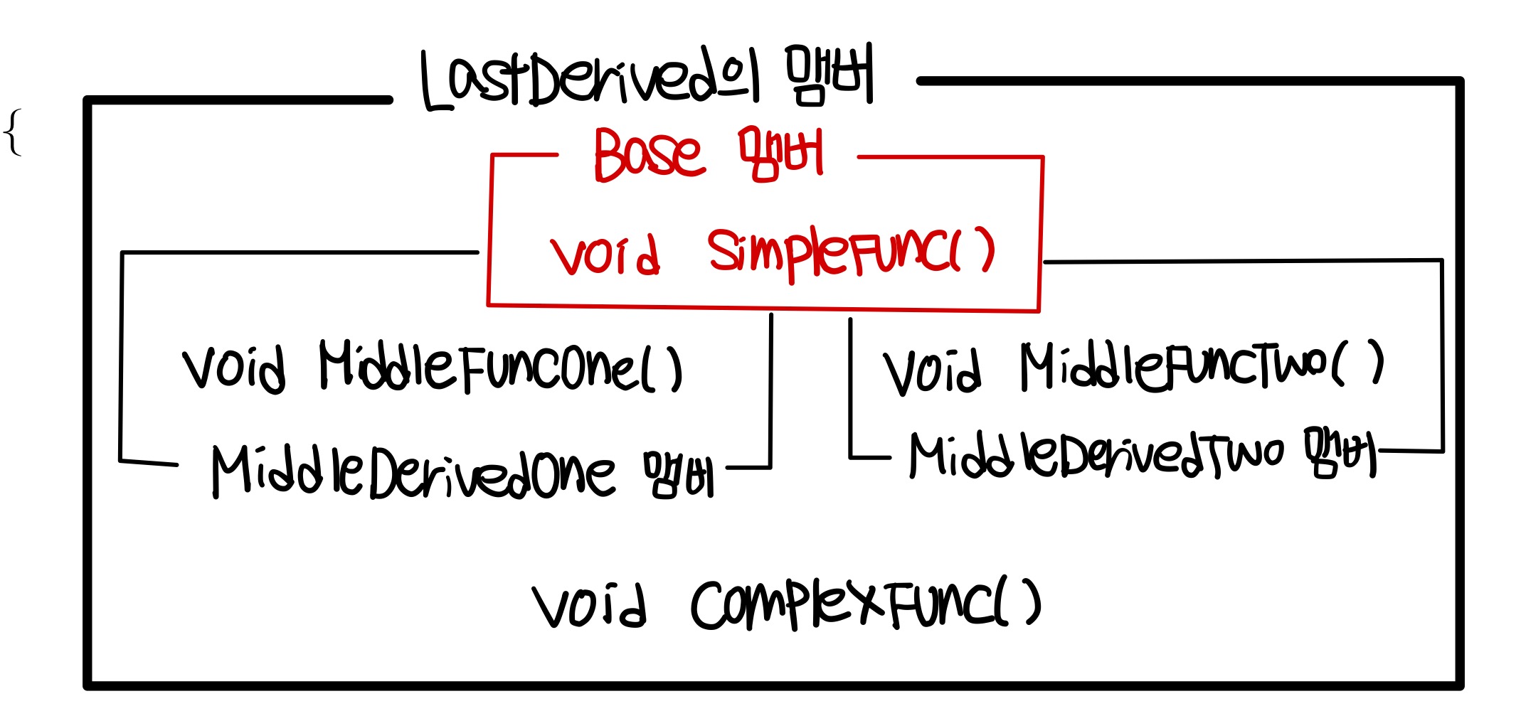 - 이와 같이 가상상속을 하지 않을 경우, 하나의 객체 내에서 두 개의 Base 클래스 맴버가 존재하기 때문에, ComplexFunc() 함수 내에서 이름만 가지고 SimpleFunc()함수를 호출할 수는 없다.