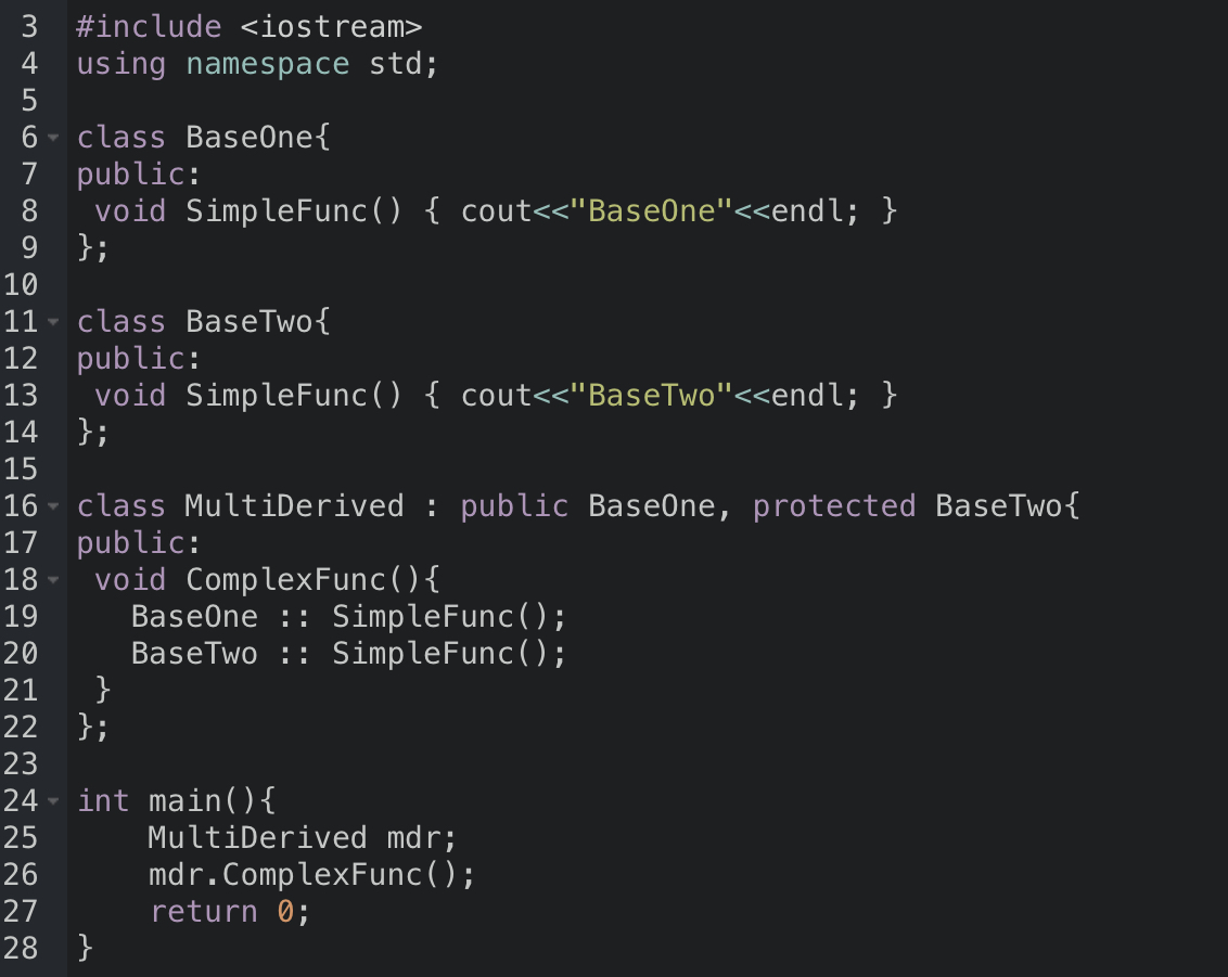 MiddleDerivedOne :: SimpleFunc(); // MiddleDerivedOne 클래스가 상속한, Base 클래스의 SimpleFunc() 함수호출 명령