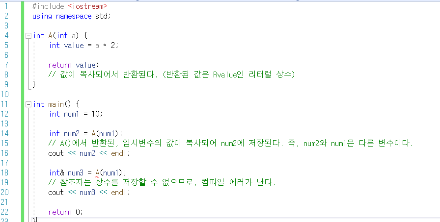 int &A() = return value; // value의 값은, A라는 이름의 참조되어 반환된다.