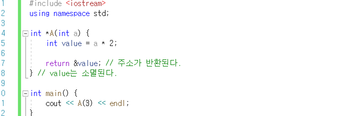 -그러나 함수 안에서 선언된, 지역 변수의 주소를 반환하고자 하면, 프로그램에서 정의되지 않은 동작이 발생한다.