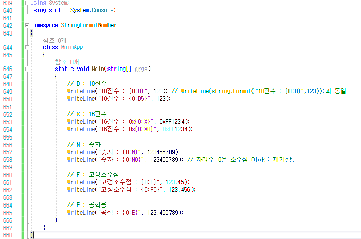 - stirng.Format() 메소드는 이렇듯 다양한 형태로 수를 서식화하는 기능을 지원한다.