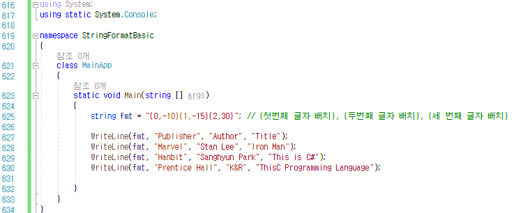 | cf ) 서식 항목의 옵션 { 서식 항목의 첨자, 왼쪽/오른쪽 맞춤, 변환 서식 지정 문자열 } ex ) Console.WirteLine("Total : {0, -7 : D}", 123); // 첨자 : 0, 맞춤 : -7, 서식 문자열 : D |
