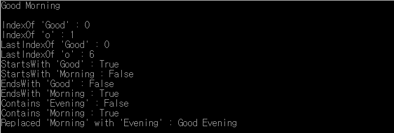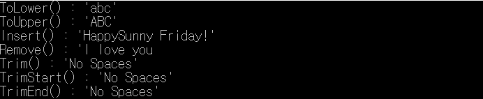 | Insert() | 현재 문자열의 지정된 위치에 지정된 문자열이 삽입된 새 문자열을 반환한다. |